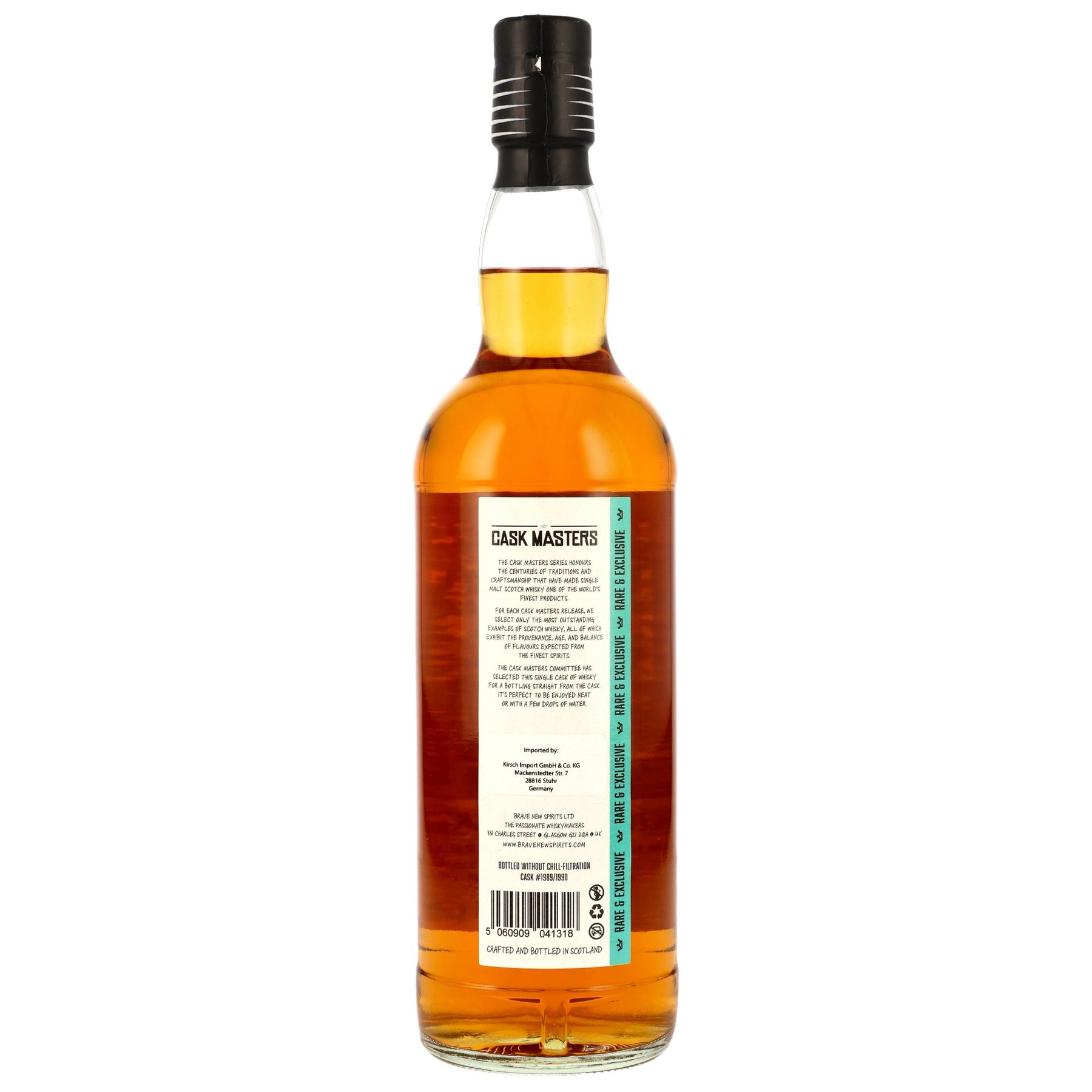 Dieser Single Cask aus der Tormore Distillery reifte im First Fill American Bourbon Barrel (#1989/1990) und zeigt bernsteinfarbene Eleganz mit komplexen Aromen von Birne, Ananas und Pfirsich. Mit 49,8 % Vol., ungefiltert und unverdünnt, bewahrt er die volle Fassstärke und cremige Textur, während ein langanhaltender, mineralischer Nachklang süße Früchte, feinherbe Schokolade und Ledernoten entfaltet. Als limitierte Abfüllung der Cask Masters Serie von Brave New Spirits vereint dieser Whisky die traditionsreiche Speyside-Handwerkskunst mit höchster Qualitätskontrolle.